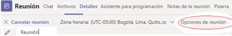 Luego de crear la reunión, abra dicha reunión en el calendario para que se muestren el menú "Opciones de reunión", presiónelo para que aparezcan