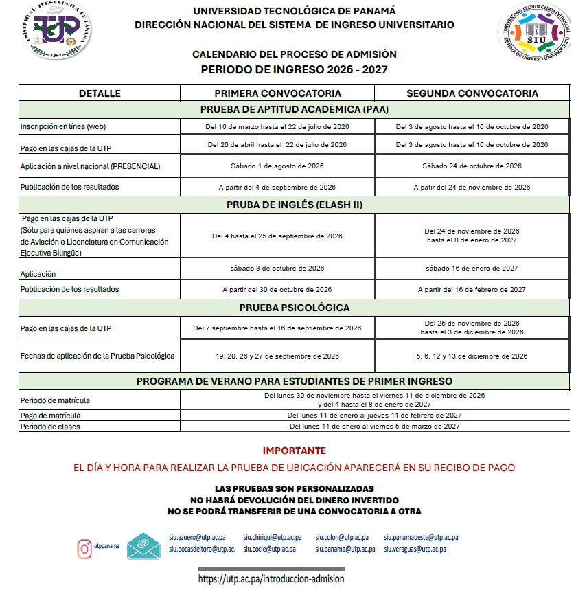 • Pago en las cajas de la UTP (Solo para quienes aspiran a las carreras de Aviación o Licenciatura en Comunicación Ejecutiva Bilingüe). Costo B/.20.00: 4 hasta el  25 de septiembre de 2026