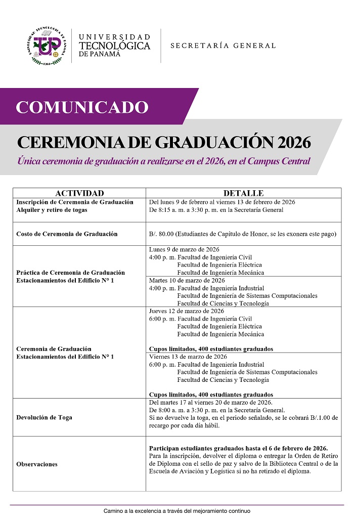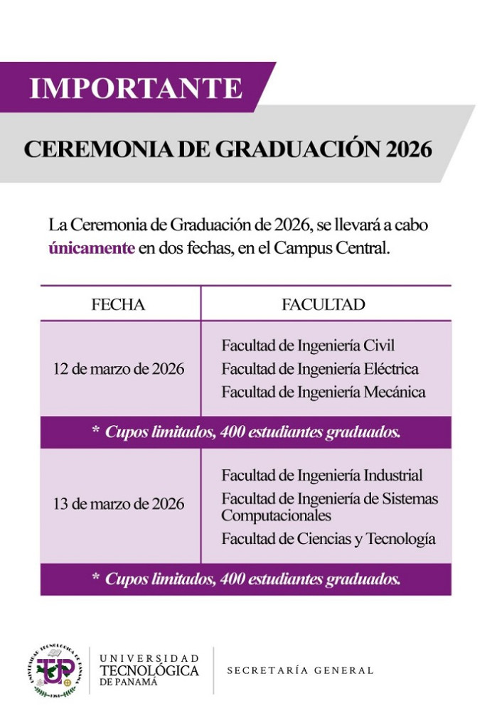 La Universidad Tecnológica de Panamá (UTP) informa que el próximo jueves 12 y vienes 13 de marzo de 2026 se realizará las dos únicas Ceremonia de Graduación de la Promoción 2025, en el Campus Central Dr. Víctor Levi Sasso, a realizarse en los estacionamientos del Edificio #1.