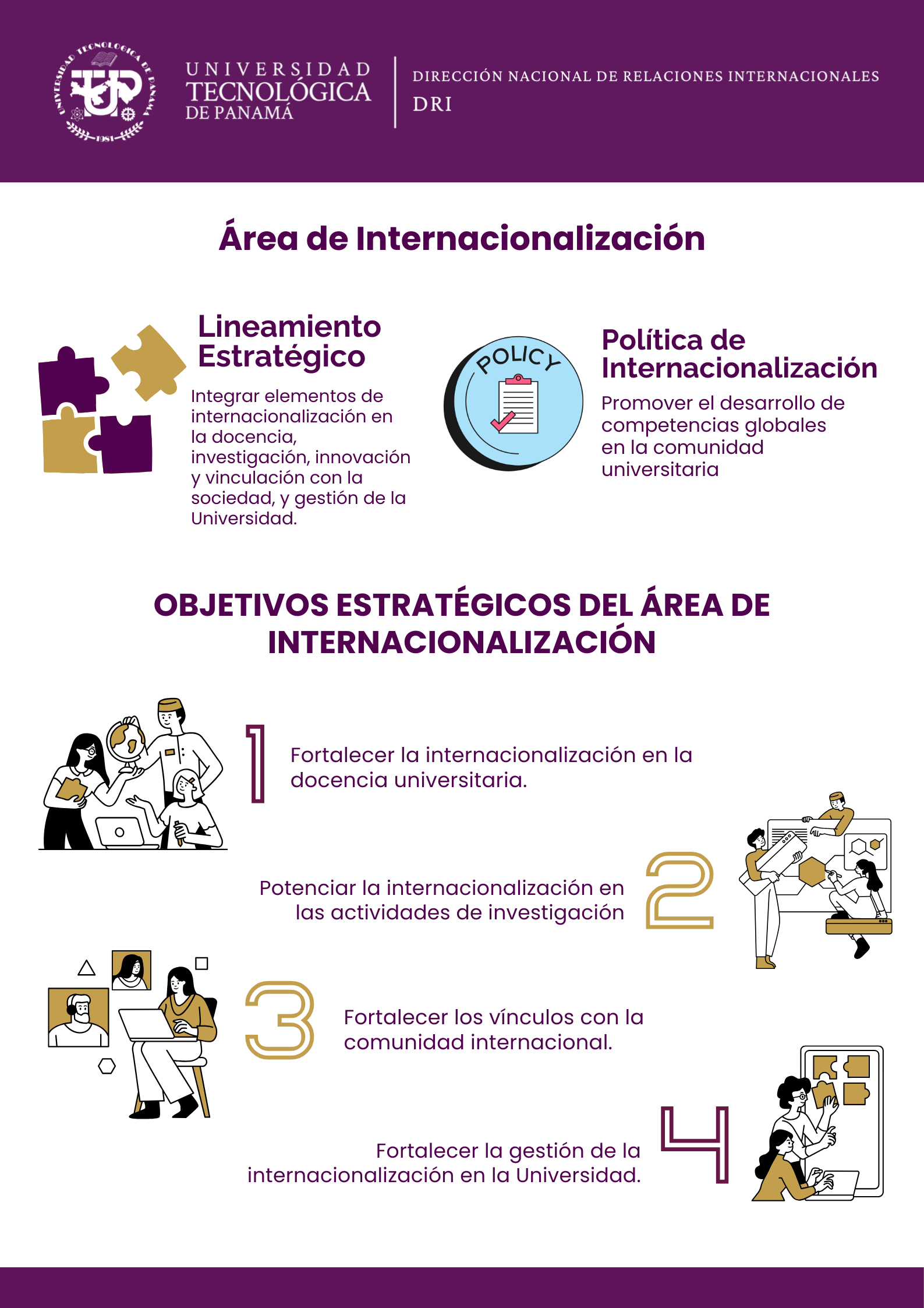 - Actúa como un agente activo en las relaciones de la Universidad Tecnológica de Panamá con las universidades del exterior y organismos regionales e internacionales de integración universitaria y cooperación.