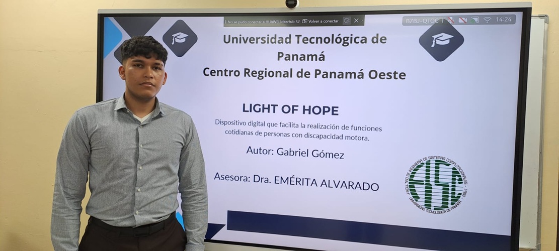 Gabriel F. Gómez, estudiante de la Licenciatura en Ingeniería de Sistemas y Computación de la Facultad de Ingeniería de Sistemas Computacionales del Centro Regional de Panamá Oeste de la Universidad Tecnológica de Panamá (UTP), sustentó el 17 de noviembre de 2025 su trabajo de graduación teórico-práctico titulado “Light of Hope: Dispositivo digital que facilita la realización de funciones cotidianas de personas con discapacidad motora”, bajo la asesoría de la Dra. Emérita Alvarado.