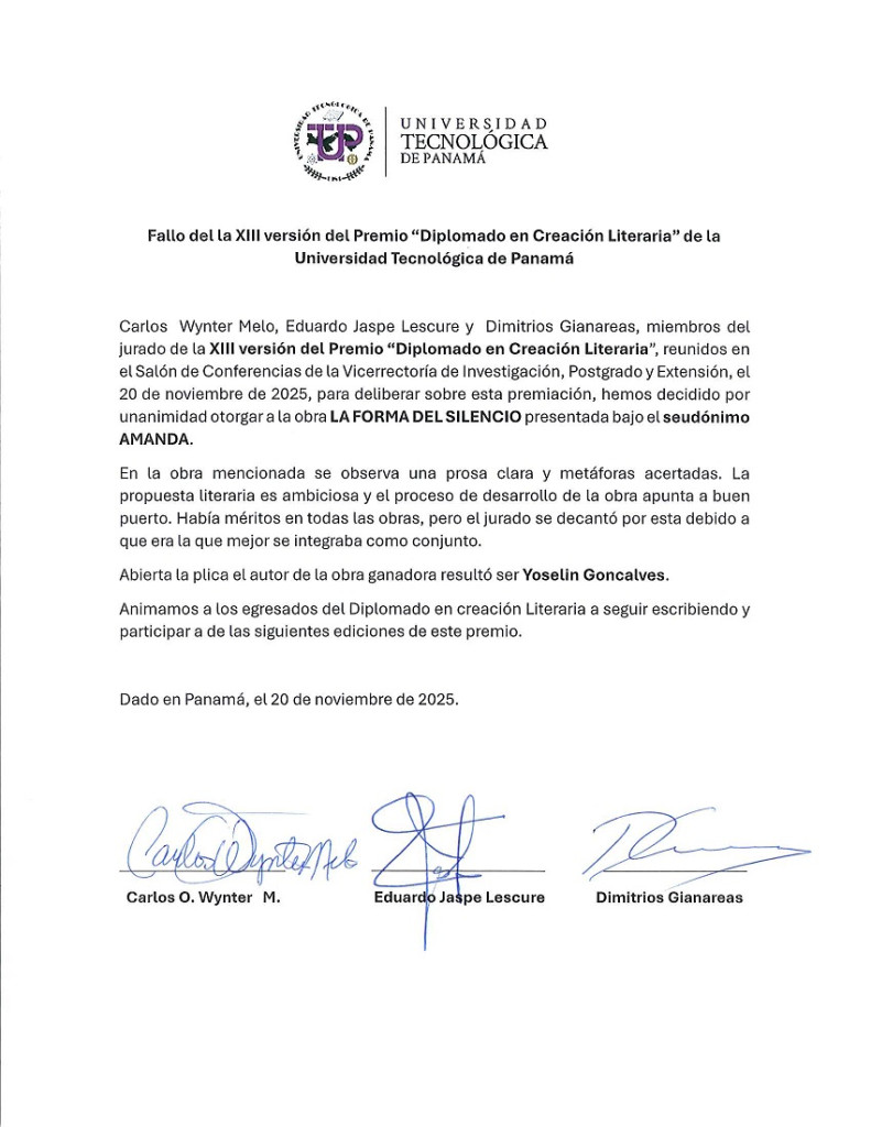 El 20 de noviembre de 2025, el Salón de Conferencias de la Vicerrectoría de Investigación, Postgrado y Extensión, de la Universidad Tecnológica de Panamá (UTP) se convirtió en el escenario donde la palabra escrita halló su espacio de celebración. Ocho obras fueron sometidas a una rigurosa deliberación por parte de un jurado de reconocida trayectoria, integrado por Carlos Wynter Melo, Eduardo Jaspe Lescure y Dimitrios Gianareas.