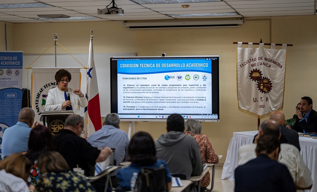 La directora de la Dirección Ejecutiva de Currículo (DEC), Dra. Anayansi Escobar, explicó que la actividad fue organizada por la representante de la Coordinación Académica de la UTP, en conjunto con la Comisión Técnica de Desarrollo Académico (CTDA), con el objetivo de fortalecer el proceso de evaluación de los diseños curriculares de carreras y programas ofrecidos por universidades particulares.
