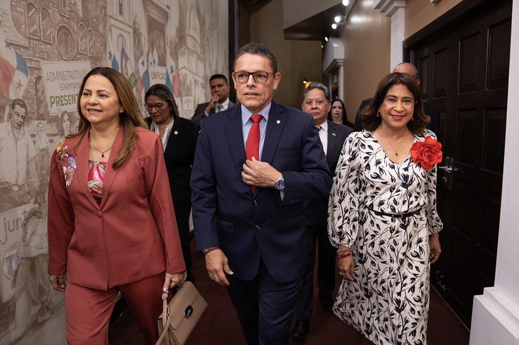 El ministro del MINSEG, Frank Ábrego, junto a su esposa, Ángela de Ábrego, y directivos de este ministerio fueron recibidos por la Dra. Ángela Laguna Caicedo, Rectora de la UTP, quien estuvo en la mesa principal del evento celebrado en el Teatro Auditorio del Campus Central VLS.