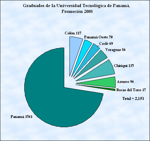 Un total de 2,151 nuevos profesionales formaron parte de la promoción 2008, de los cuales, 1,561 corresponden a la Sede Panamá y 590 a los Centros Regionales. Las Sedes Regionales aglutinaron el 27.4% del total de graduados; siendo el Centro Regional de Chiriquí el que contó con la cifra más alta de egresados (135); seguido de los Centros Regionales de Colón y Azuero, los cuales graduaron 117 y 96 nuevos profesionales, respectivamente.