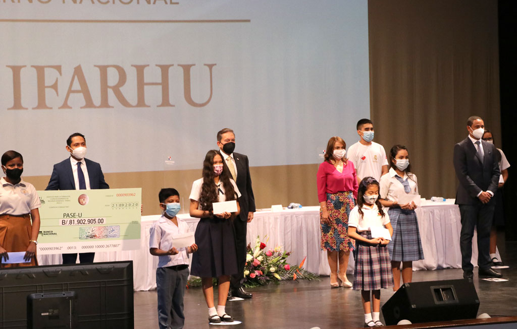 El Presidente de la República, S. E. Laurentino Cortizo Cohen, hizo entrega simbólica de las 20 primeras becas del Programa de Asistencia Social Educativa (PASE-U), que administra el Instituto para la Formación y Aprovechamiento de Recursos Humanos (IFARHU), a estudiantes de colegios oficiales y particulares del país, en el Teatro Auditorio de la Universidad Tecnológica de Panamá (UTP), el lunes 21 de septiembre.