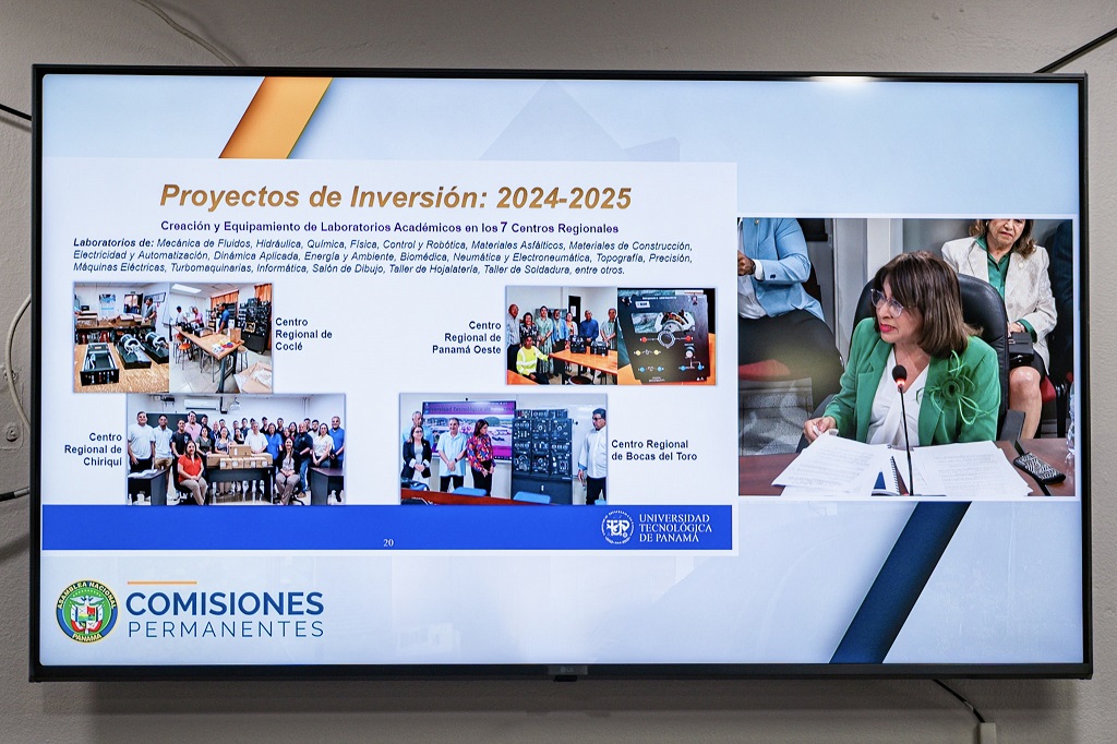 La Rectora de la Universidad Tecnológica de Panamá (UTP), Dra. Ángela Laguna Caicedo, presentó ante la Comisión de Presupuesto de la Asamblea Nacional el presupuesto recomendado por el Ministerio de Economía y Finanzas para el año 2026 por un monto de B/. 144.1 millones.