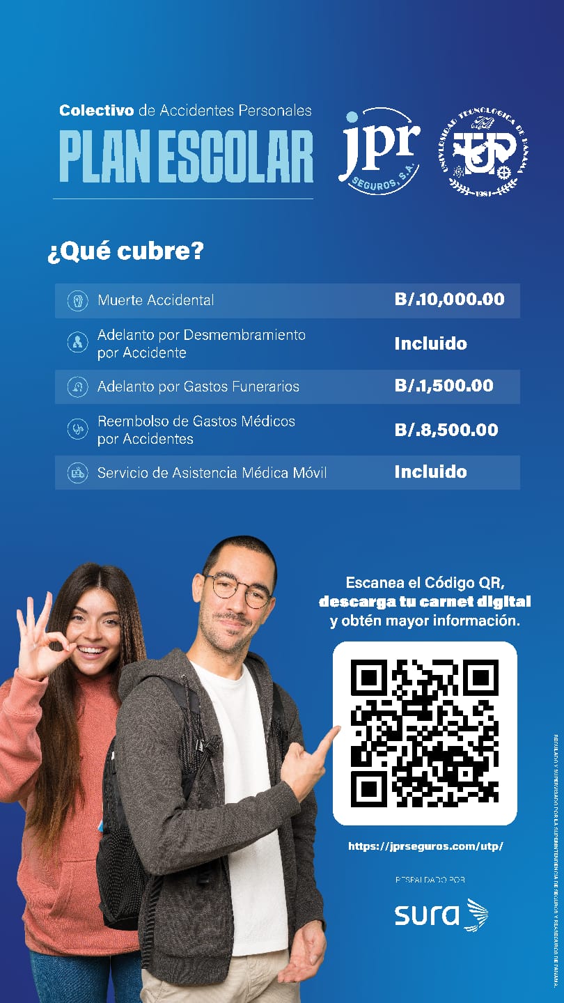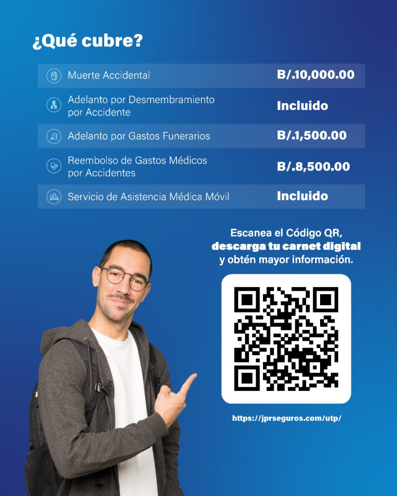 La Universidad Tecnológica de Panamá (UTP), comprometida con el bienestar y la seguridad de sus estudiantes, ofrece a toda la comunidad universitaria un Seguro contra Accidentes Personales que brinda protección durante su formación académica.
