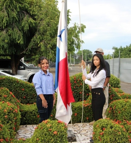 La ceremonia inició con la izada del Pabellón Nacional, a cargo de las estudiantes que ocupan los primeros puestos de honor del Centro Regional: Patricia Gutiérrez, de la Licenciatura en Comunicación Ejecutiva Bilingüe, quien obtuvo el primer puesto; y Joselyn De Gracia, estudiante de la Licenciatura en Desarrollo y Gestión de Software, quien alcanzó el tercer puesto de honor.