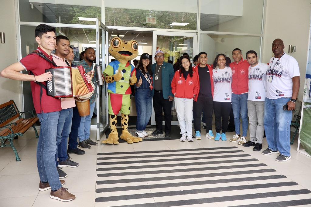 El Director de Deportes de la UTP, Profesor Vicente Duncan con la Mascota de los IV Juegos Suramericanos de la Juventud Panamá 2026 y atletas universitarios.